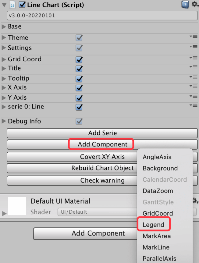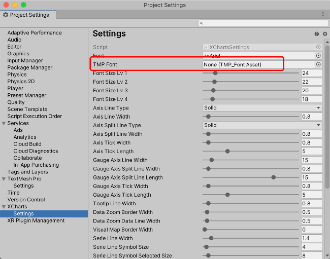 建议在项目初就规划好是否使用TextMeshPro,并设置好字体。在已有很多图表的情况下切换TMP时,可能某些图表无法自动刷新,可以手动点击Rebuild Chart Object